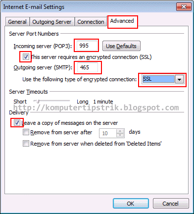 26. Kalau perlu beri centang pada Leave a copy of messages on the server (agar nantinya mail yang sudah masuk ke Ms outlook, tetap tersimpan dan bisa dibuka melalui internet browser)