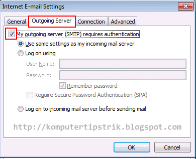 20. Pilih tab Outgoing Server, beri centang pada My outgoing server (SMTP) requires authentication